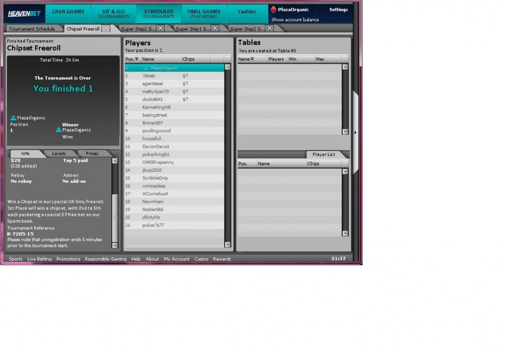 It was at that time I entered a freeroll. I had forgotten about them with everything that's gone on this week, and it was the first time I had played a MMT in a while. On top of that I entered into the GSOP step 1 for $ 1.05 and there basically a lotto style sat. Everyone is all in every hand until the prizes are decided. I ended up finishing 2nd twice in a row and got free tickets to play again at the same level, and the 3rd time I managed to win a step 2 ticket for $14-70. I entered into the next available tournament and boom won that to, and so I now have the final stage GSOP ticket worth $210. They only run once a week on a Sunday and normally have 3 packages up for grabs with about 40 runners. I have won two packages already and been to Malta and of course just returned back from Vienna. But it will be awesome to win a package for just $1-05. So I was buzzing from that, and I ended up winning the freeroll and now await a chipset branded from PokerHeaven. Not bad for nothing.